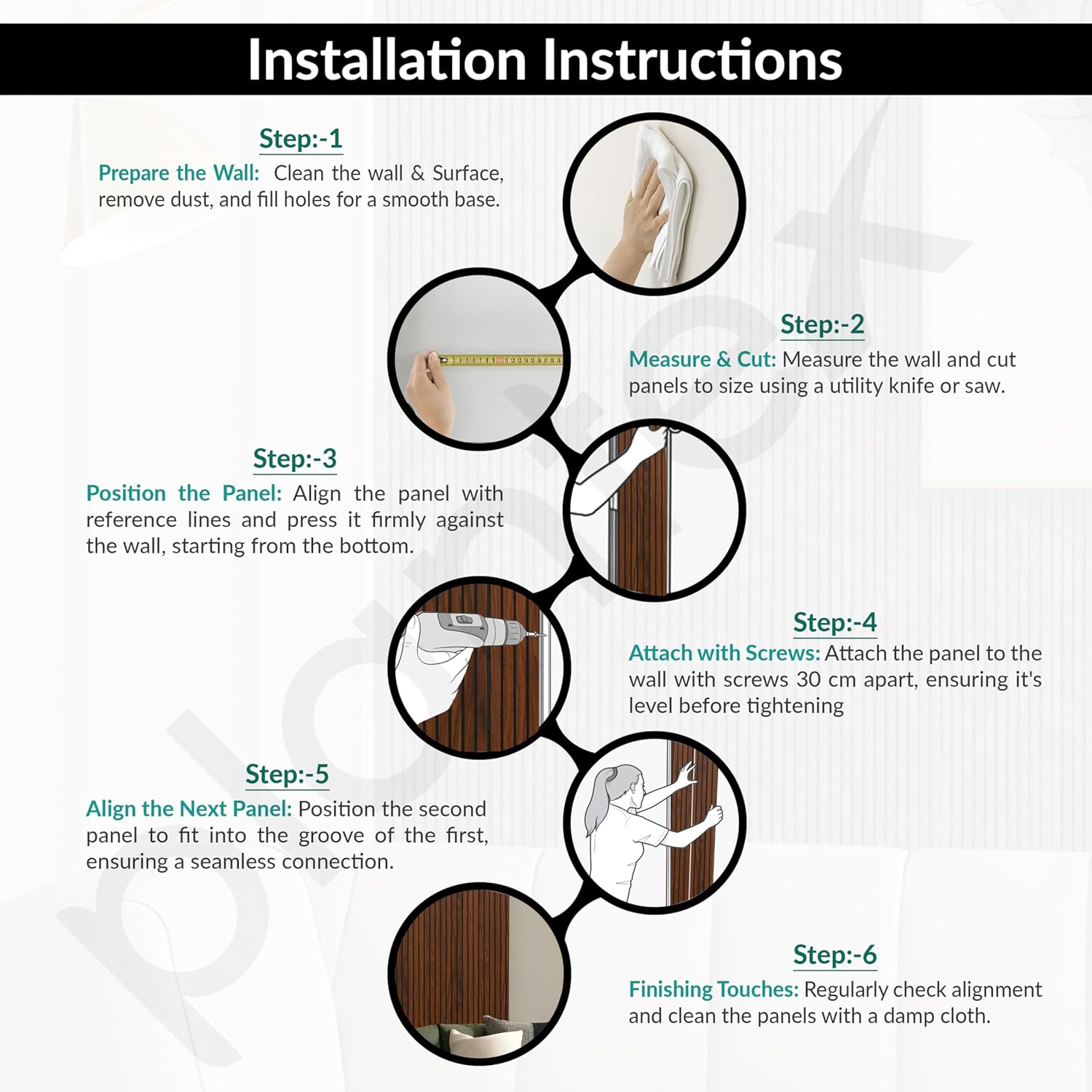 - 𝐇𝐚𝐬𝐬𝐥𝐞-𝐅𝐫𝐞𝐞 𝐈𝐧𝐬𝐭𝐚𝐥𝐥𝐚𝐭𝐢𝐨𝐧: wall panel Designed for quick and secure installation, these lightweight PVC panels can be easily mounted using screws, ensuring a strong and durable hold. They do not require complex tools or extensive preparation, making them a convenient option for both DIY projects and professional installations.